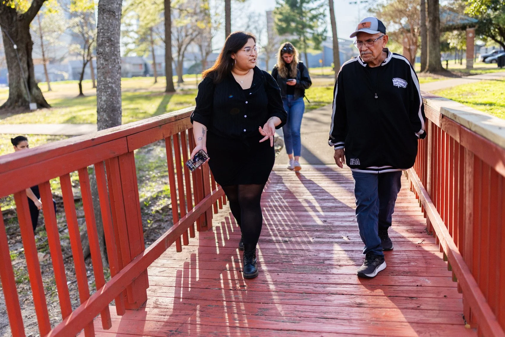 Pictured: Perez out in the field interviewing Carlos Mauricio, a former resident of Colony Ridge, a town on the outskirts of Houston.