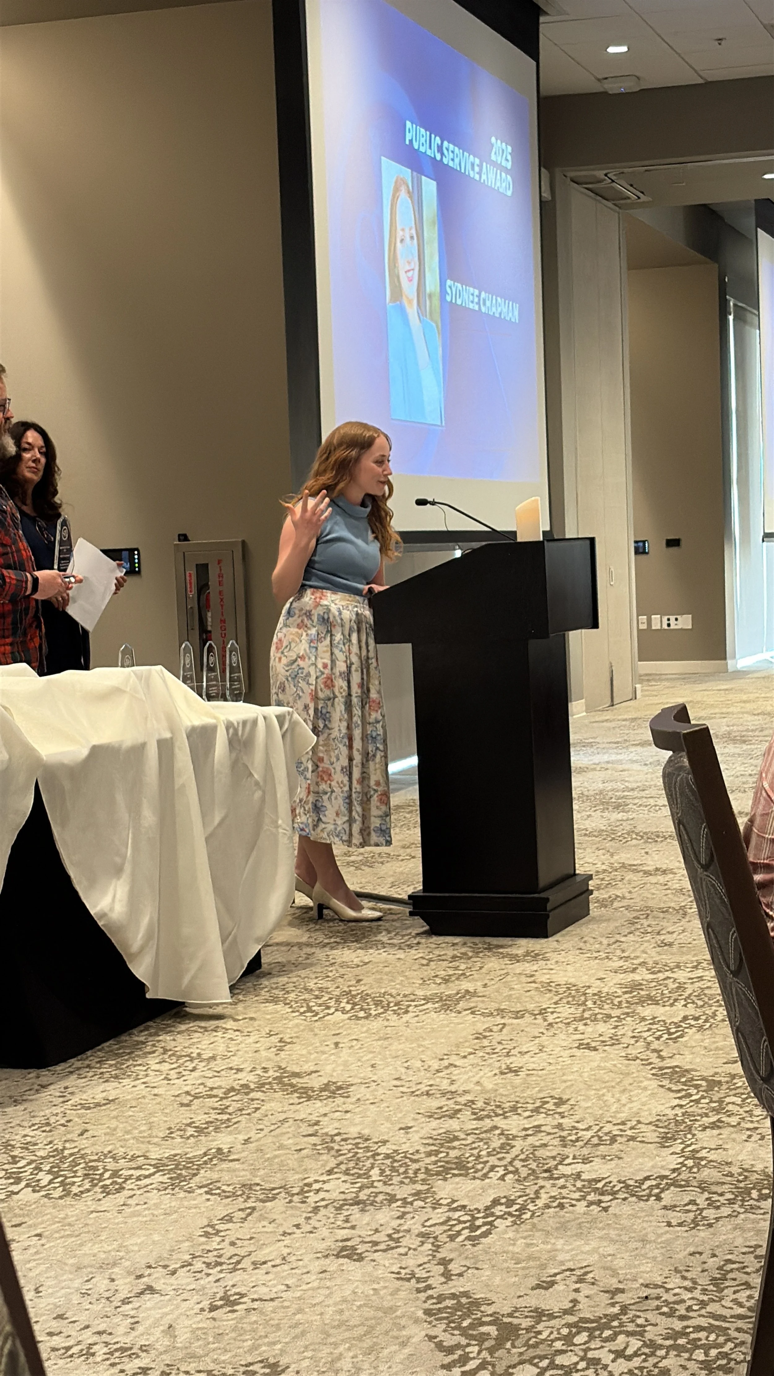 Sydnee gives at the 2025 Utah SPJ awards ceremony after accepting the chapter's Public Service recognition for her investigation into housing vouchers. (Photo by Adan Velasquez)